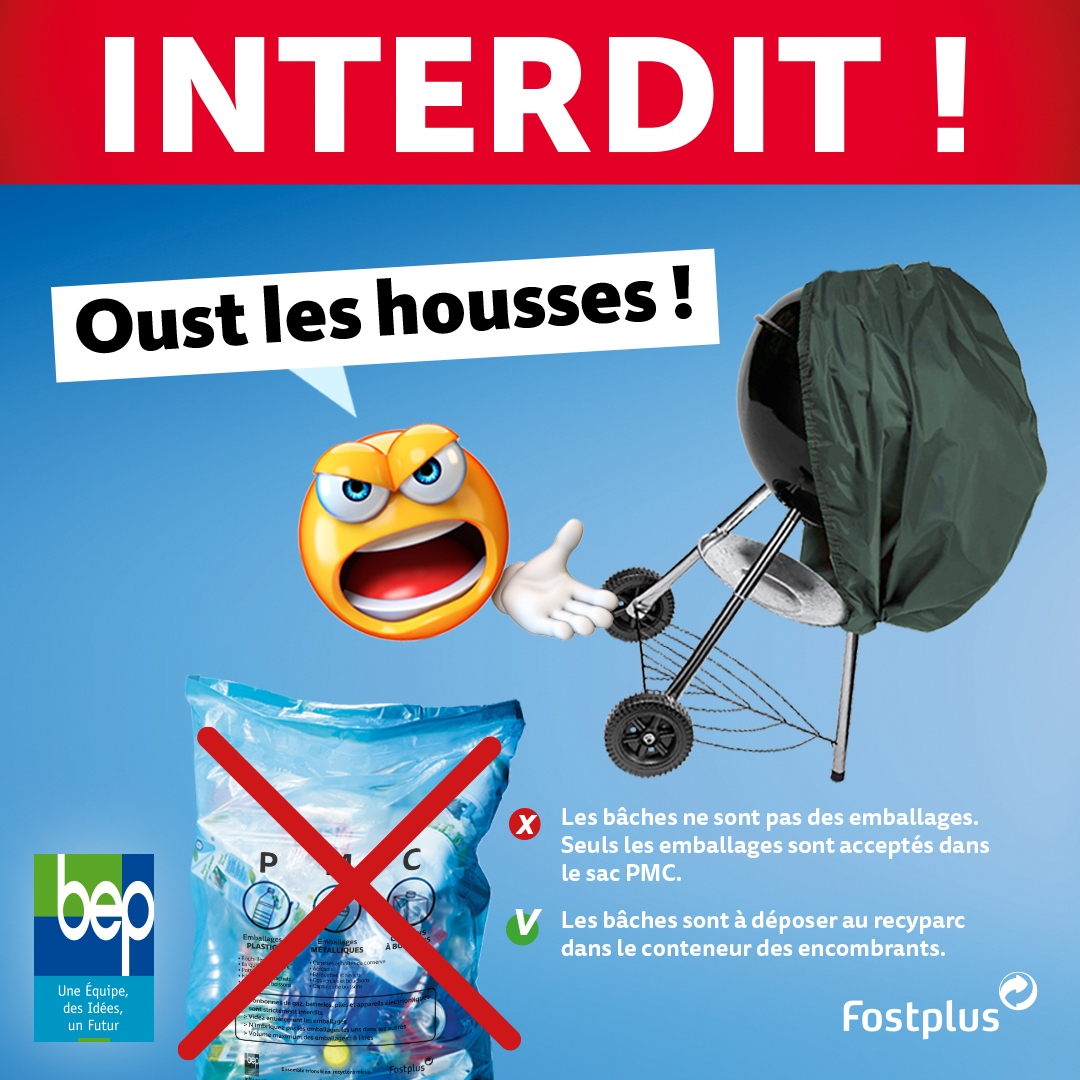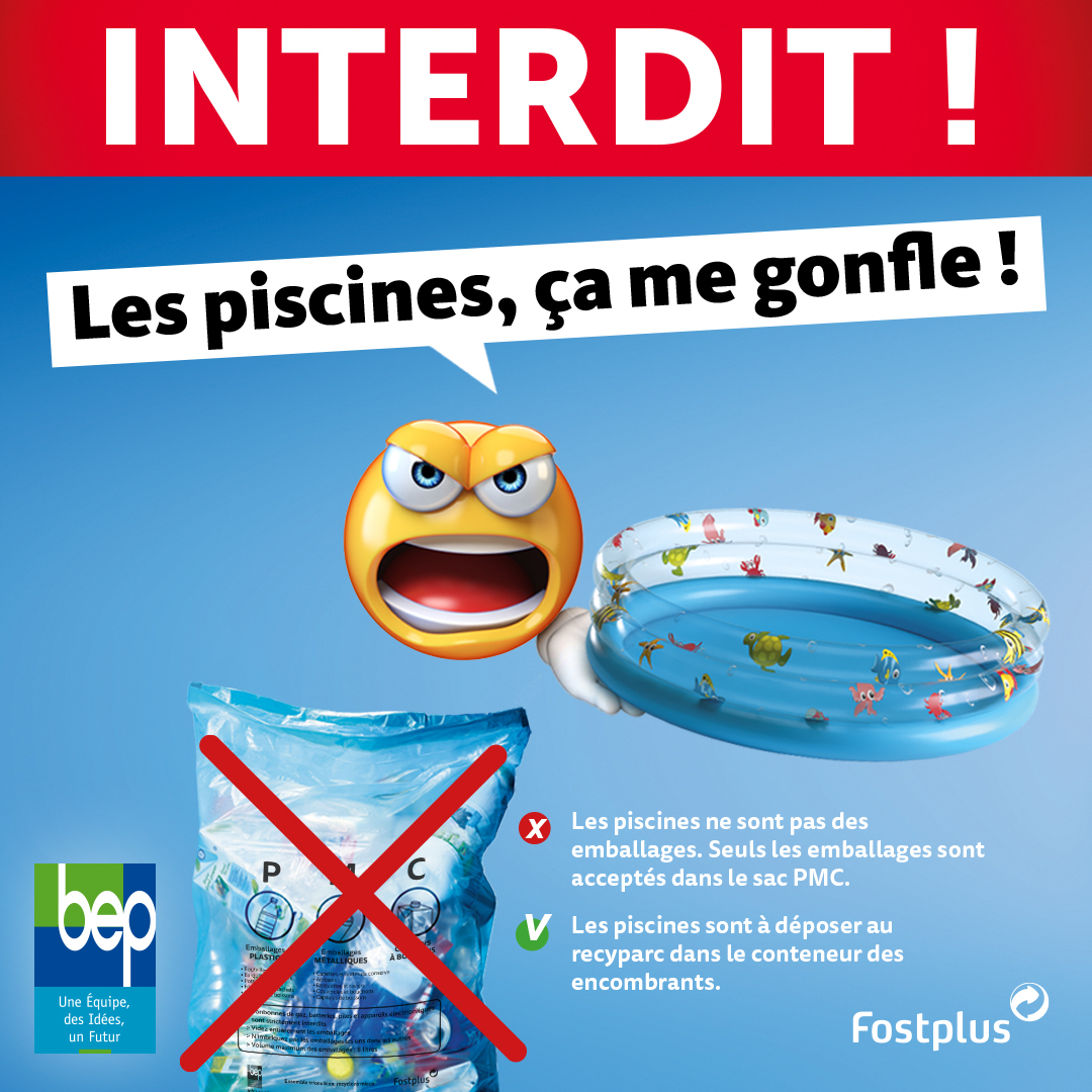 Par exemple, une piscine gonflable ou des jouets peuvent être en plastique mais ne sont pas des emballages => direction le recyparc pour la piscine trouée et les ordures ménagères pour les jouets cassés.