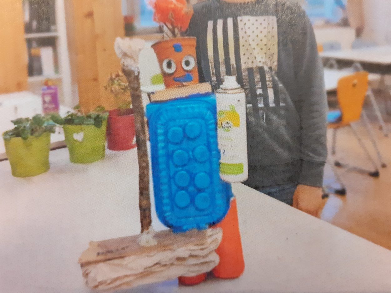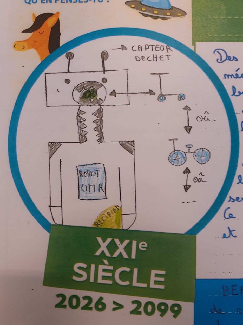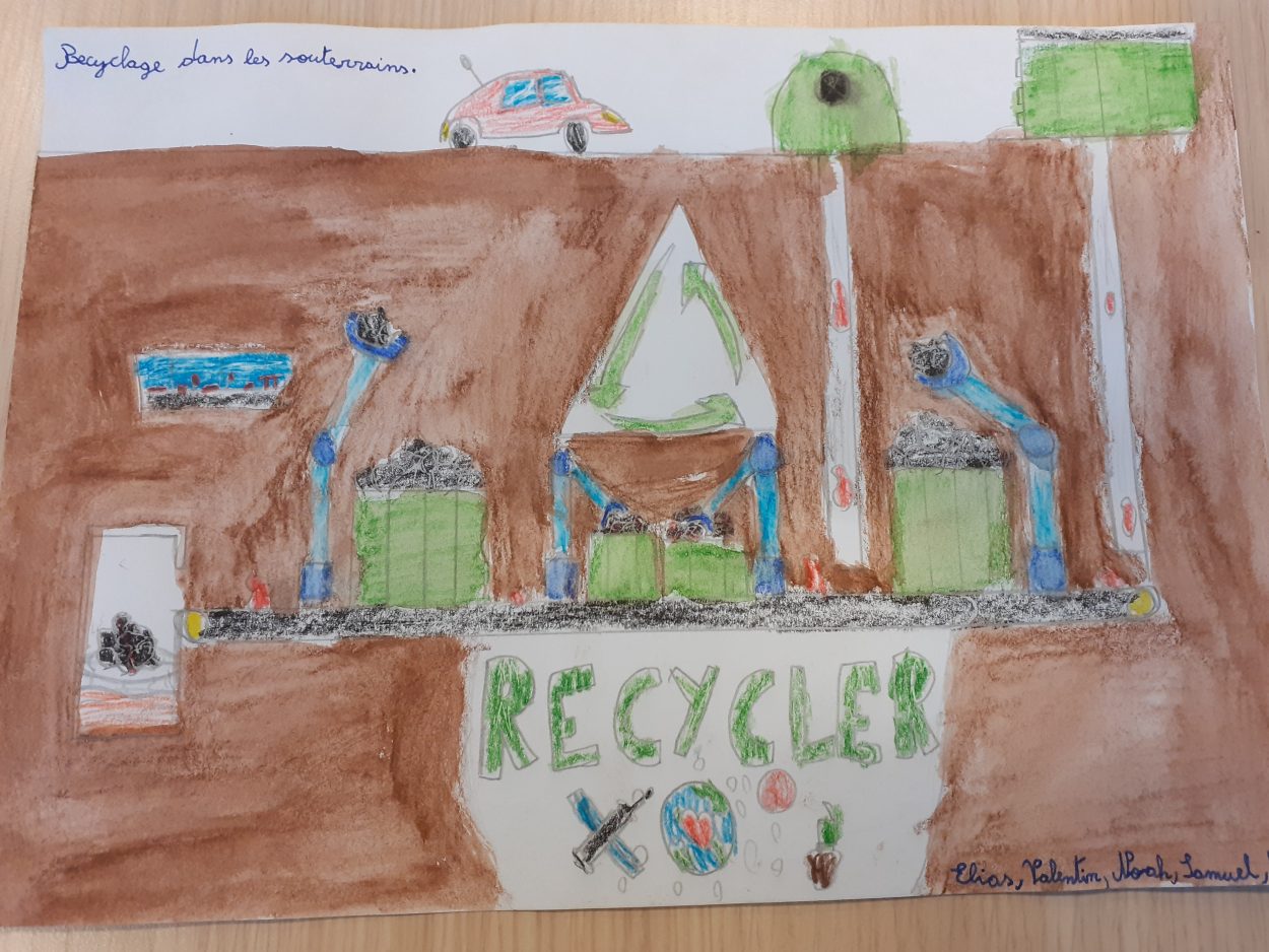 Plein d’idées originales et ludiques sont sorties des productions des enfants: robots trieurs, pigeons ramasseurs de déchets, voitures roulant grâce aux déchets ramassés, loi zéro déchet appliquée à tous les magasins, loi qui favorise les déchets biodégradables, poubelles de tri souterraines, déchets envoyés et détruits dans l’espace, de drônes qui détectent et trient les déchets dans les bonnes poubelles…
