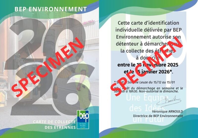 Chaque agent de BEP Environnement dispose d’une carte nominative d’autorisation de collecte des étrennes, aux couleurs et avec le logo du BEP: n’hésitez pas à la demander! Celle-ci vous permettra de vérifier qu’il s’agit bien d’un ouvrier de la collecte des déchets.