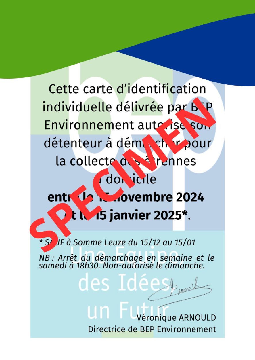 Chaque agent de BEP Environnement dispose d’une carte nominative d’autorisation de collecte des étrennes, aux couleurs et avec le logo du BEP: n’hésitez pas à la demander! Celle-ci vous permettra de vérifier qu’il s’agit bien d’un ouvrier de la collecte des déchets.