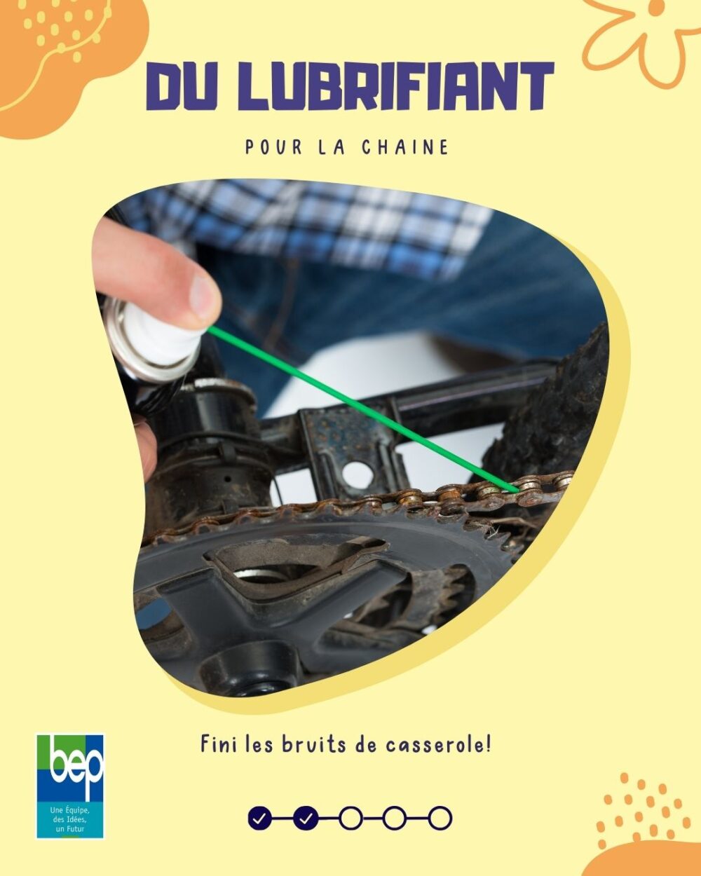 - Lubrifiant pour chaîne – Un peu d’huile, et fini les bruits de casserole.