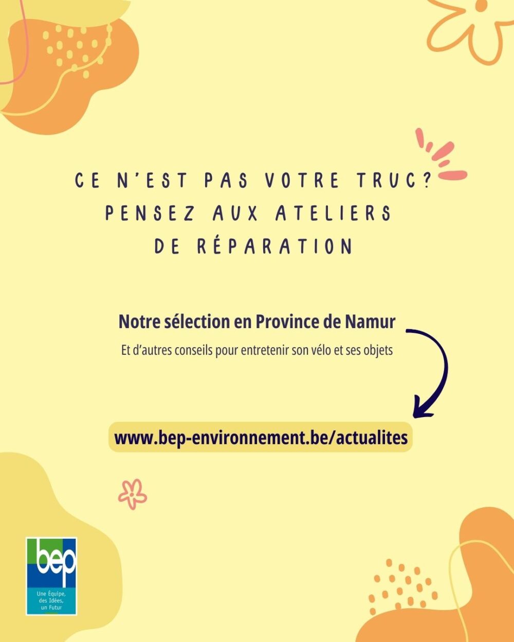 Un Guidon pour 2 Mains ASBL Cette association dispose d’un atelier-vélo à Ciney, accessible sur rendez-vous via la Maison Citoyenne. Ils offrent des services de réparation et peuvent partager des conseils pour l’entretien de votre vélo.